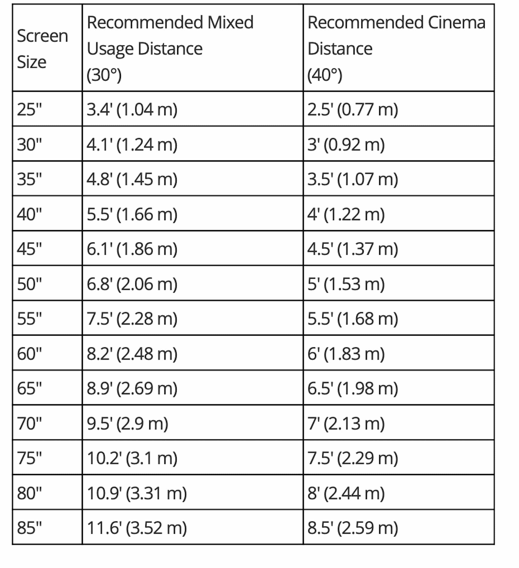 Nhiều nhà sản xuất TV như Samsung khuyến nghị khách hàng nên ngồi cách màn hình từ 1,5 đến 2,5 lần kích thước đường chéo màn hình. Tuy nhiên, đối với các TV 4K, do độ phân giải ảnh tăng lên nên cách tính sẽ khác hơn một chút với khoảng cách lý tưởng là từ 1-1,5 lần kích thước màn hình của TV. Ở khoảng cách này, mắt sẽ không nhận thấy các pixel vì thế người dùng có thể xem hình ảnh trên TV với độ chi tiết chân thật nhất. Lưu ý rằng, ngoài độ phân giải cũng cần nên chú ý đến kích thước TV, chẳng hạn như nếu bạn có TV 4K 65 inch thì bạn nên ngồi cách 1,6m – 2,5m là vừa đẹp. Dưới đây là biểu đồ mô tả khoảng cách theo kích thước TV.